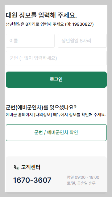 · 로그인 시 이름, 군번, 생년월일 6자리를 입력하면 별도의 회원가입 없이 바로 수강이 가능합니다.