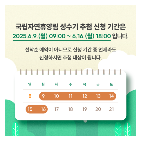 2025년 여름 성수기 자연휴양림 이용 신청이 6월 9일부터 16일까지 '숲나들e' 누리집에서 진행됩니다. 시원한 숲 속 휴가를 원하신다면 꼭 신청 기간을 놓치지 마세요!