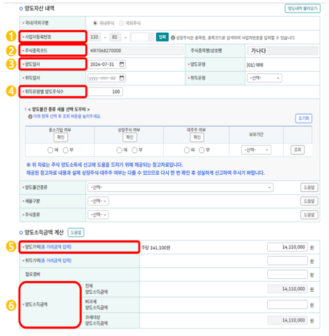 불러오기 클릭하면 사업자등록번호, 주식종목코드, 양도일자, 양도주식수, 양도가약, 양도소득금액이 자동으로 채워집니다.