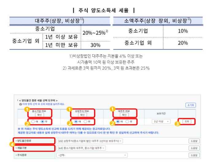 중소기업, 상장주식, 대주주 관련 도움자료를 제공하여 납세자가 해당 여부를 선택하면 세율이 자동 적용됩니다.