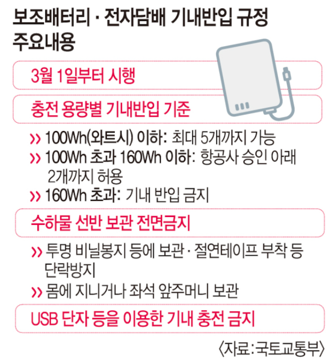 국토교통부는 항공기 내 리튬배터리 화재 위험성을 줄이기 위해 2025년 3월 1일부터 보조배터리 및 전자담배의 기내 반입 규정을 대폭 강화합니다. 이는 최근 에어부산 화재사고를 계기로 항공기 내 안전관리 체계를 정비한 결과입니다.