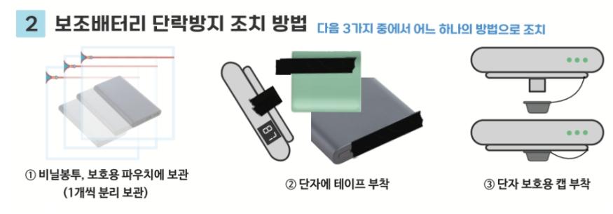 · 보조배터리의 단자가 금속과 접촉하지 않도록 절연테이프 부착 또는 보호용 파우치 지퍼백 등에 개별 보관해야 합니다.