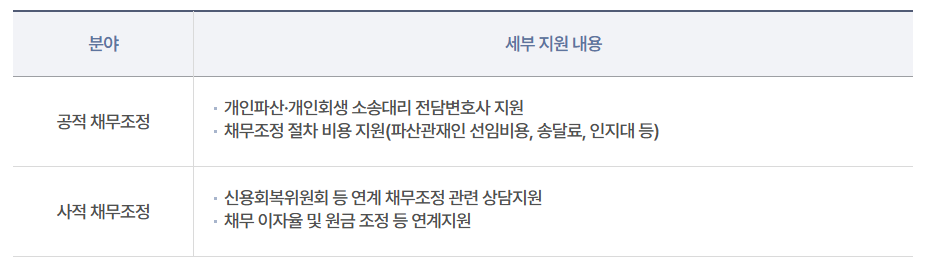 지원 내용: 공적 채무 조정(정부 지원 프로그램)과 사적 채무 조정(민간 채권자와 협의하여 부채 재조정)을 지원하며, 채무 상환 계획 수립을 돕습니다.