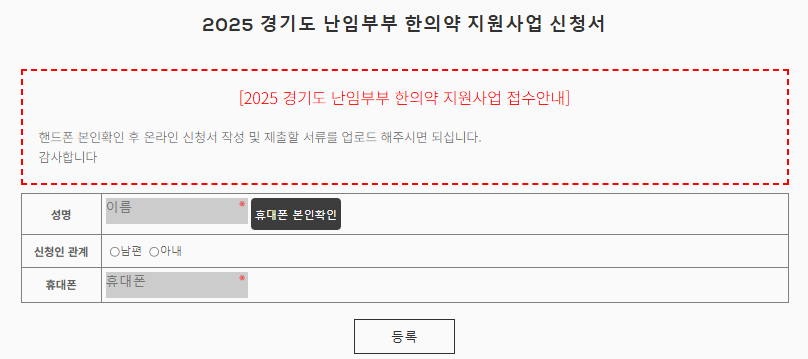 [2025 경기도 난임부부 한의약 지원사업 접수안내] 핸드폰 본인확인 후 온라인 신청서 작성 및 제출할 서류를 업로드 해주시면 되십니다. <!-- 현재 추경예산 요청중으로 대기자 접수만 받고 있으