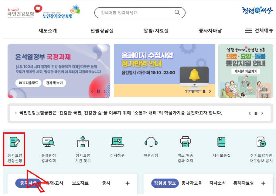 1. 국민건강보험공단 공식 웹사이트에 접속 후 '장기요양인정 신청' 메뉴를 클릭