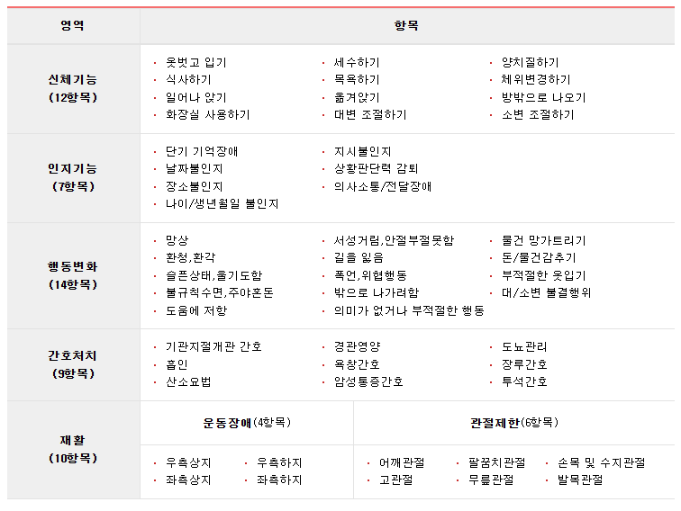 일상생활 수행이 어려운 상태 | 방문요양, 시설입소, 주야간보호, 단기보호 |