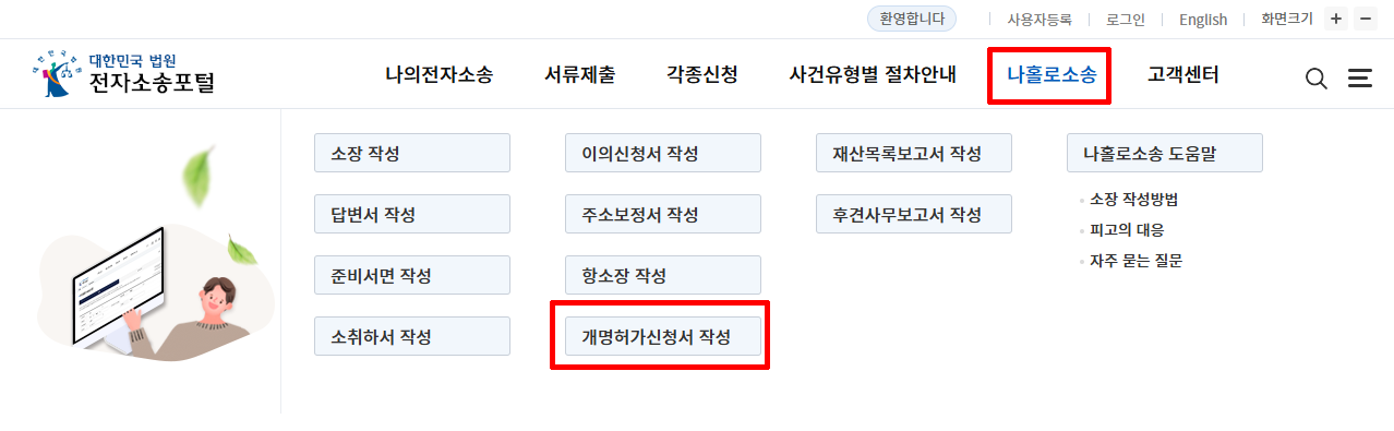 메뉴에서 "나홀로소송 > 개명허가신청서 작성" 선택