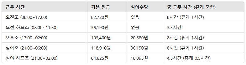 야간 수당: 22시~06시 근무 시 시급 1.5배 적용