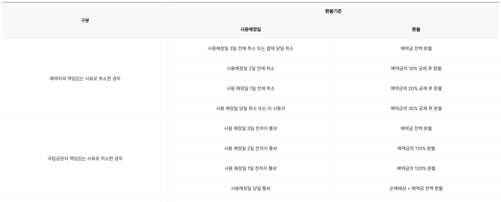· 사용예정일 3일 전에 취소 또는 결제 당일 취소: 전액(100%) 환불